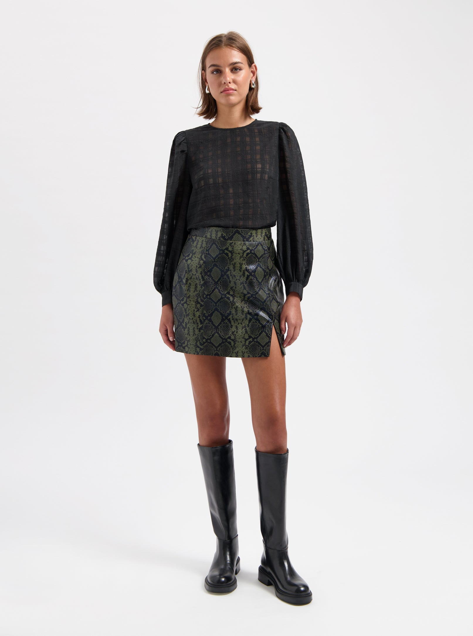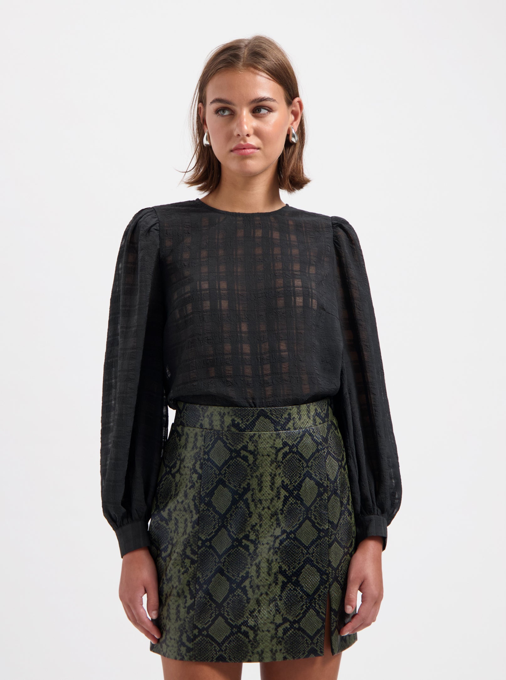 Meet our Lydie Top: black, long-sleeved top. Cut in a straight fit, defined with a round neck and puffed sleeves. Design details include a back slit closure and buttoned cuffs.