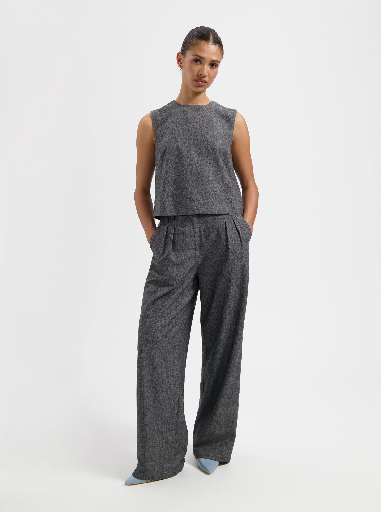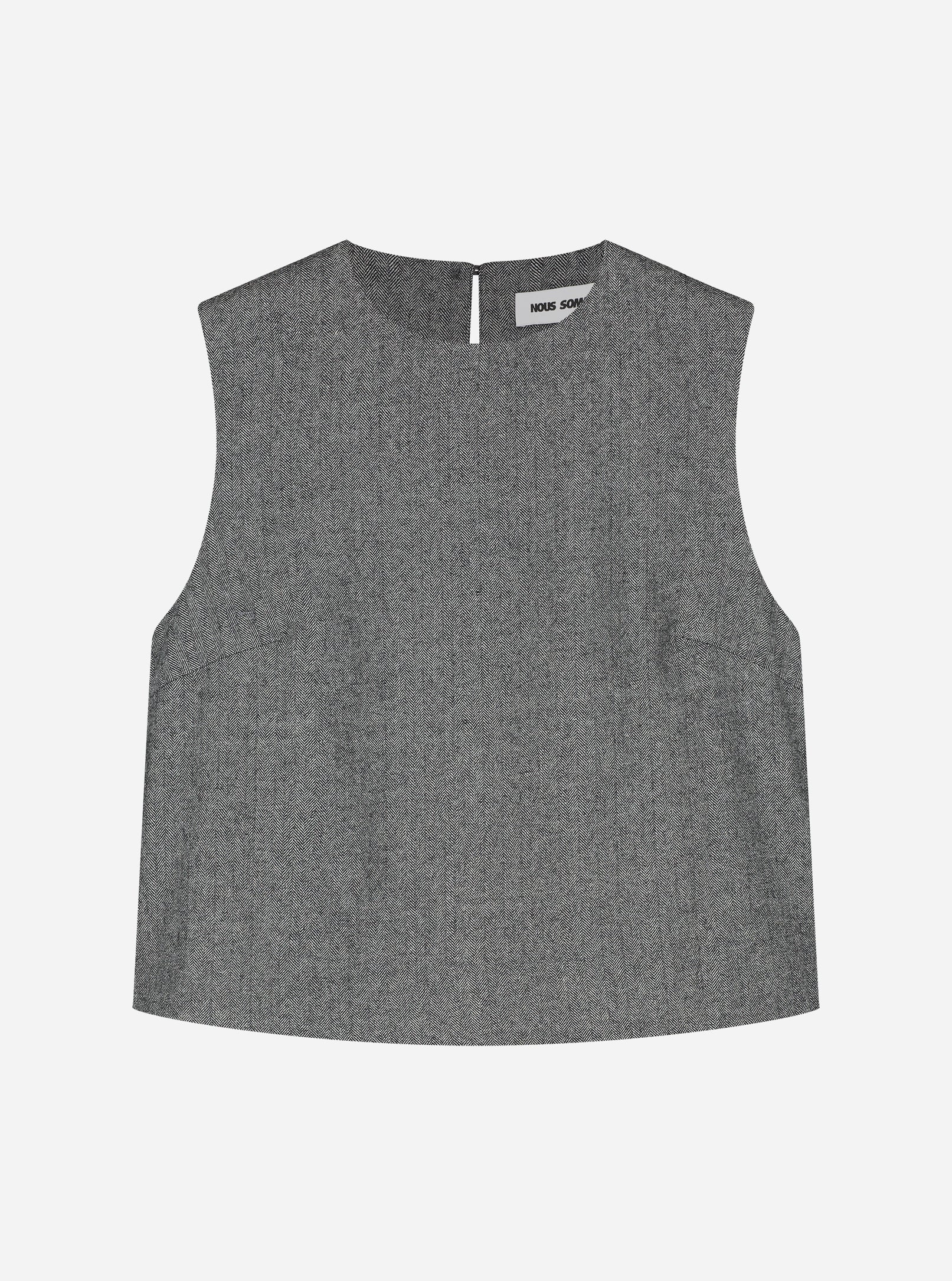 Herringbone sleeveless top with a tailored fit and subtle textured pattern, perfect for layering or wearing alone. Model is 173 cm tall and wears size S.