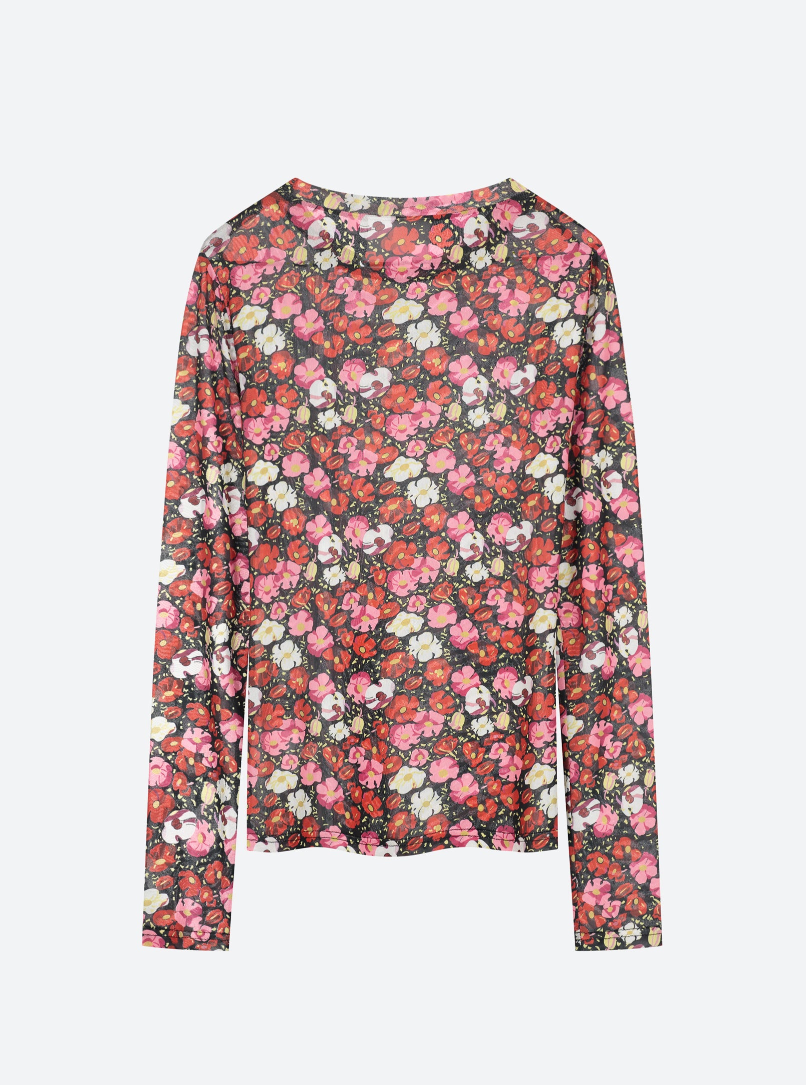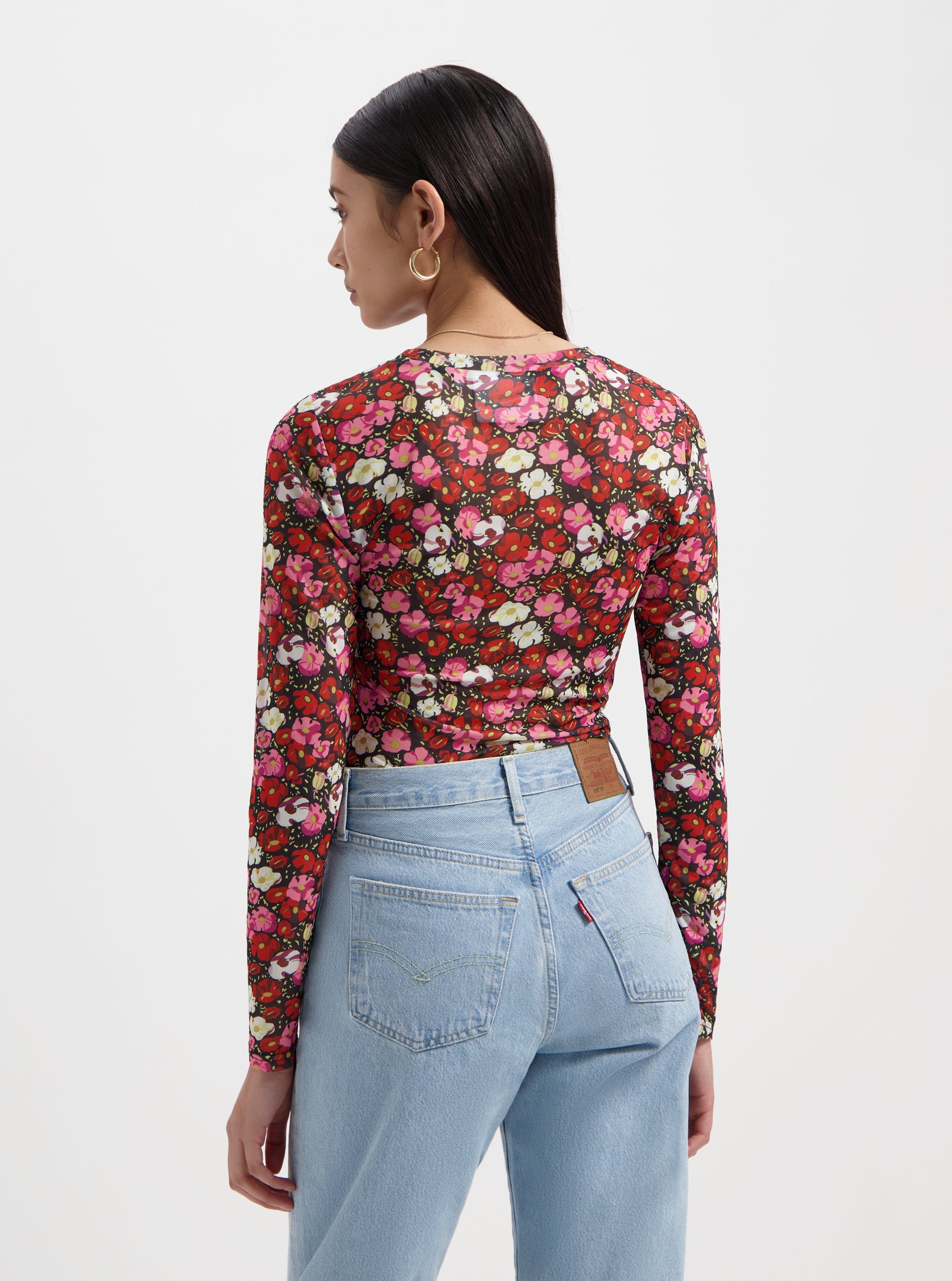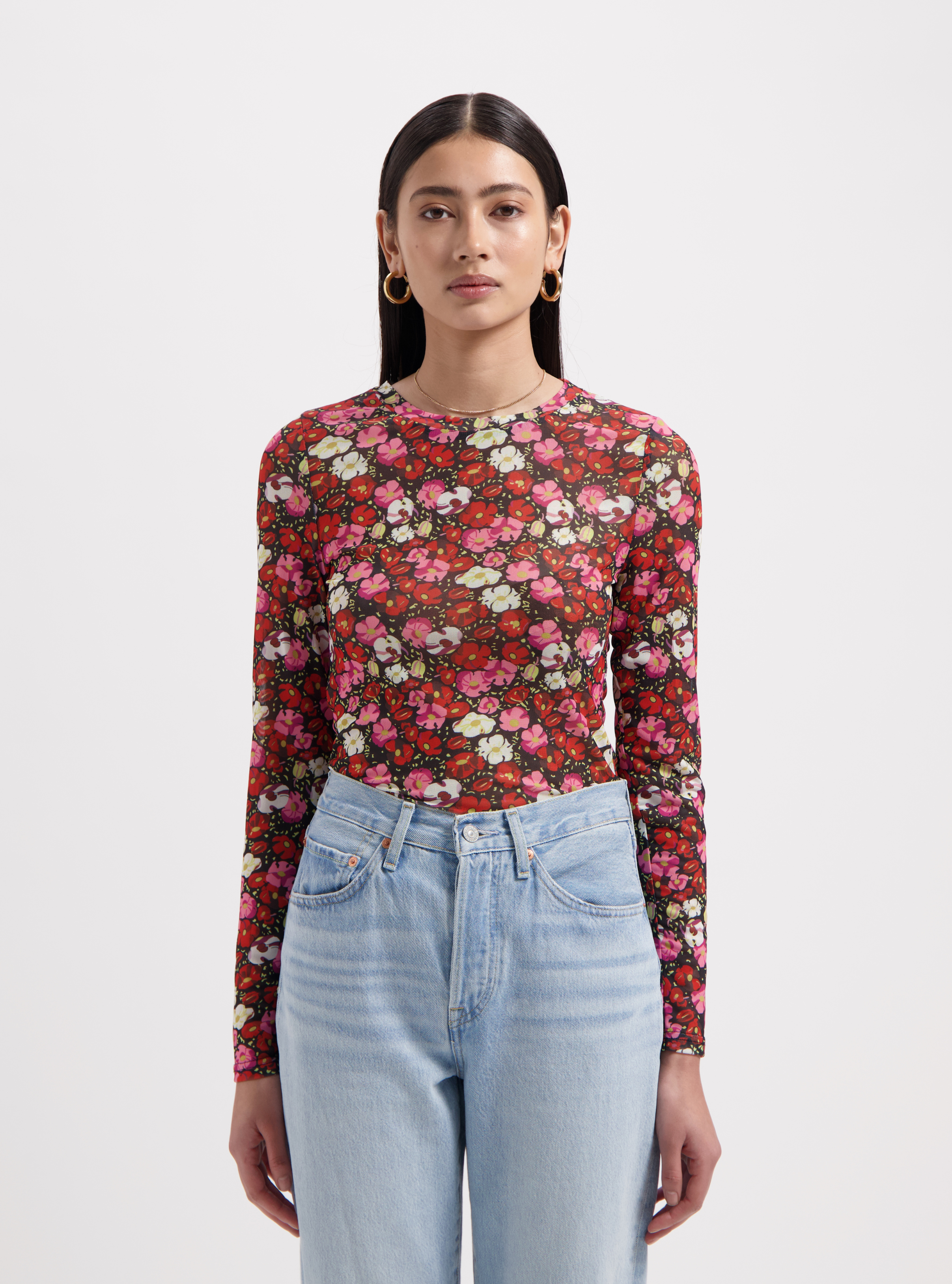 The Timmie Crew Top is a slim fitted top made from a semi-sheer mesh fabric with a playful floral pattern. Wear our Timmie Top on jeans or under a blazer.