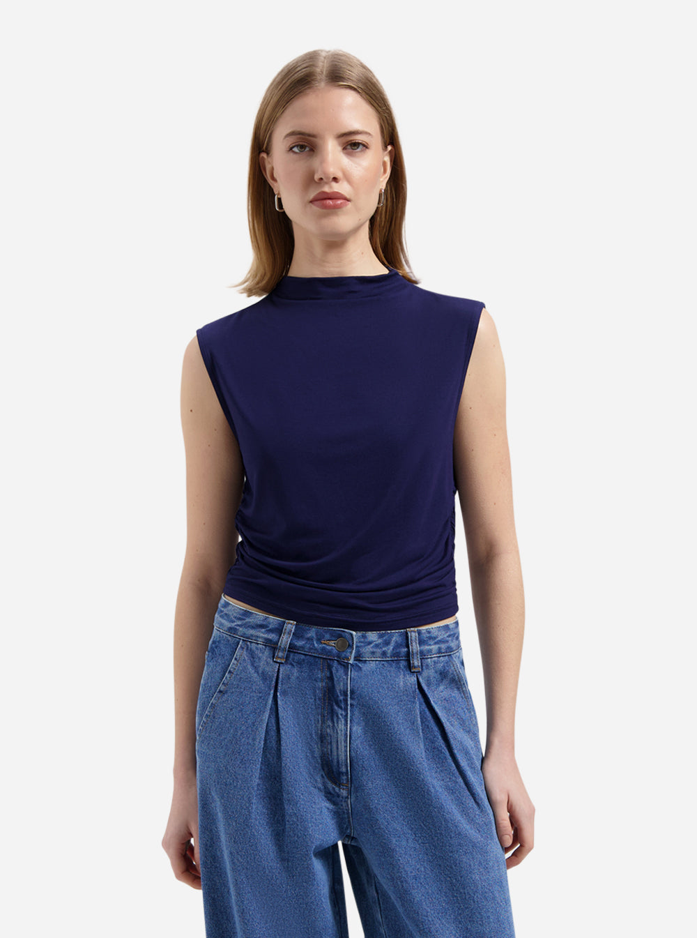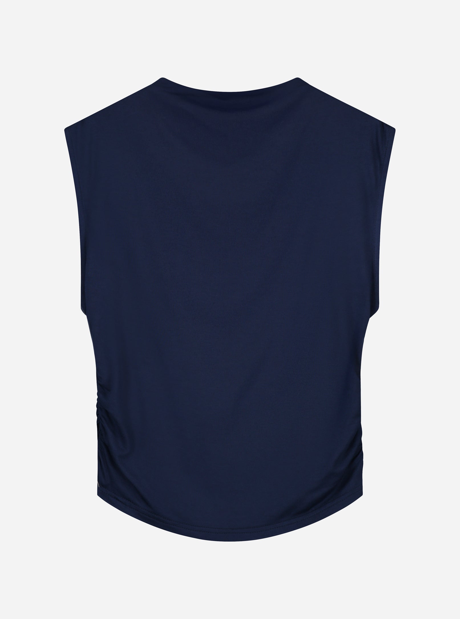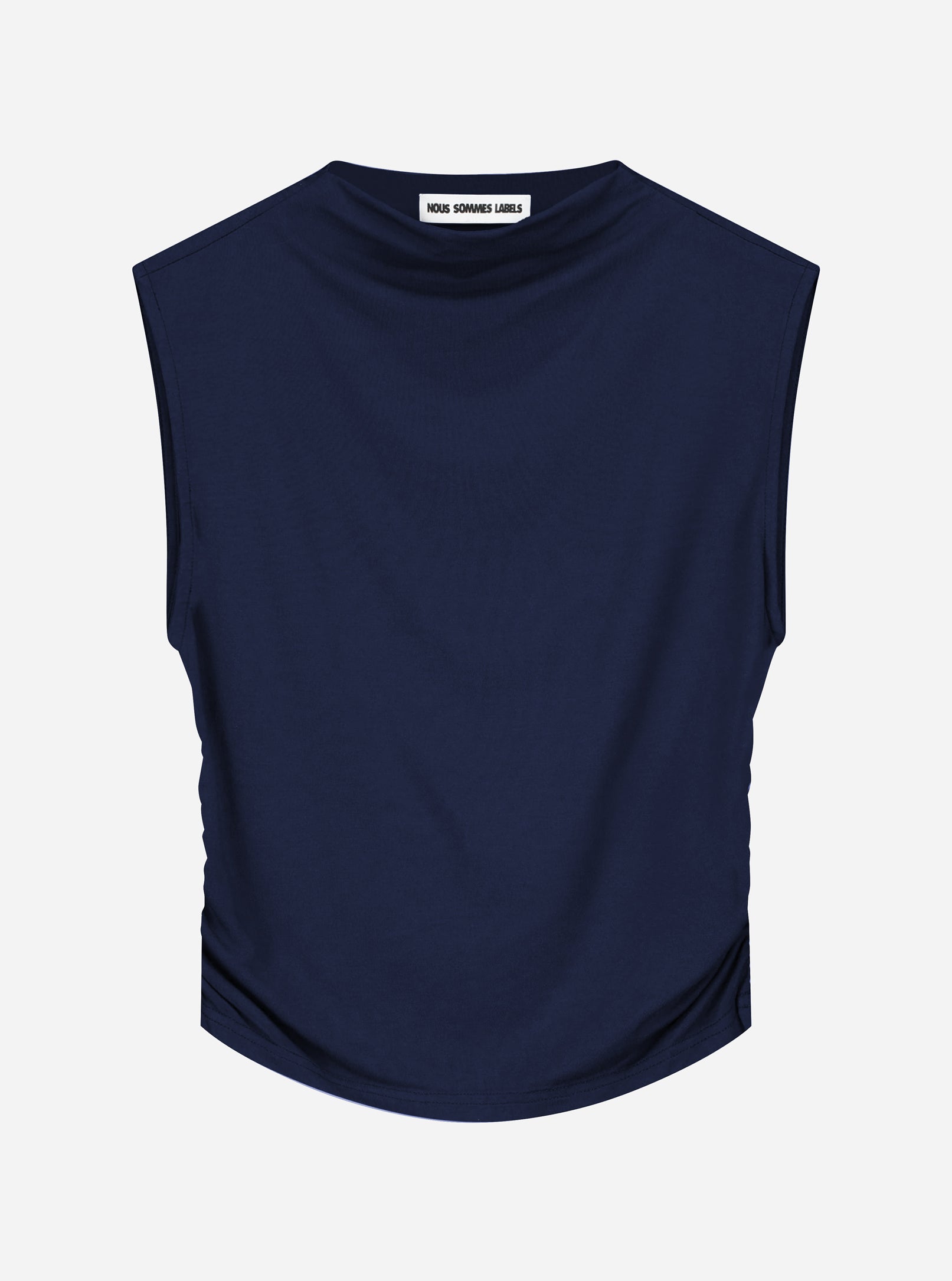 Sleek, sophisticated, and effortlessly versatile, the Jamie Top in Navy Blue is a modern essential. Designed with a flattering mock neckline, this sleeveless top exudes elegance while maintaining a minimal, refined look. The fitted silhouette hugs the body beautifully, enhanced by delicate ruching on the sides for a touch of texture and a figure-flattering effect.