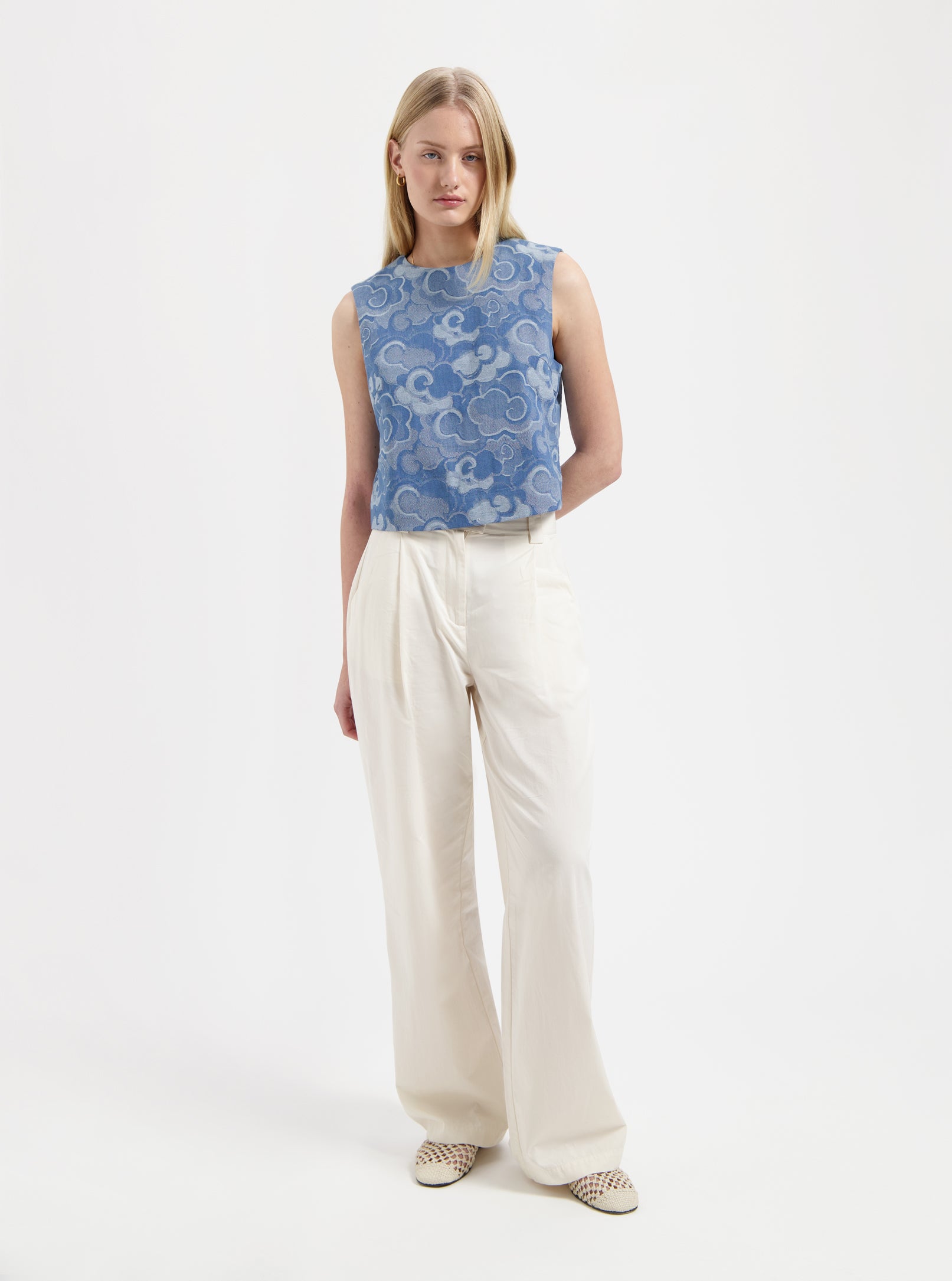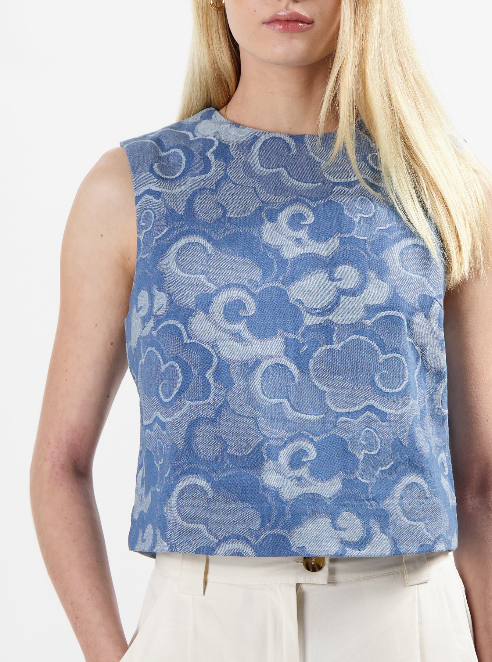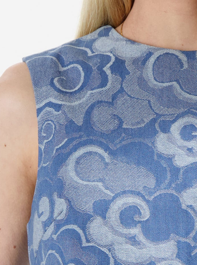 The Mira Top is a bold yet feminine piece that effortlessly combines structure with a dreamy, artistic print. This sleeveless top features a tailored, structured silhouette that highlights the natural shape of the body while offering comfort and versatility. The intricate print adds a touch of whimsy and elegance, making it the perfect statement piece for any occasion.