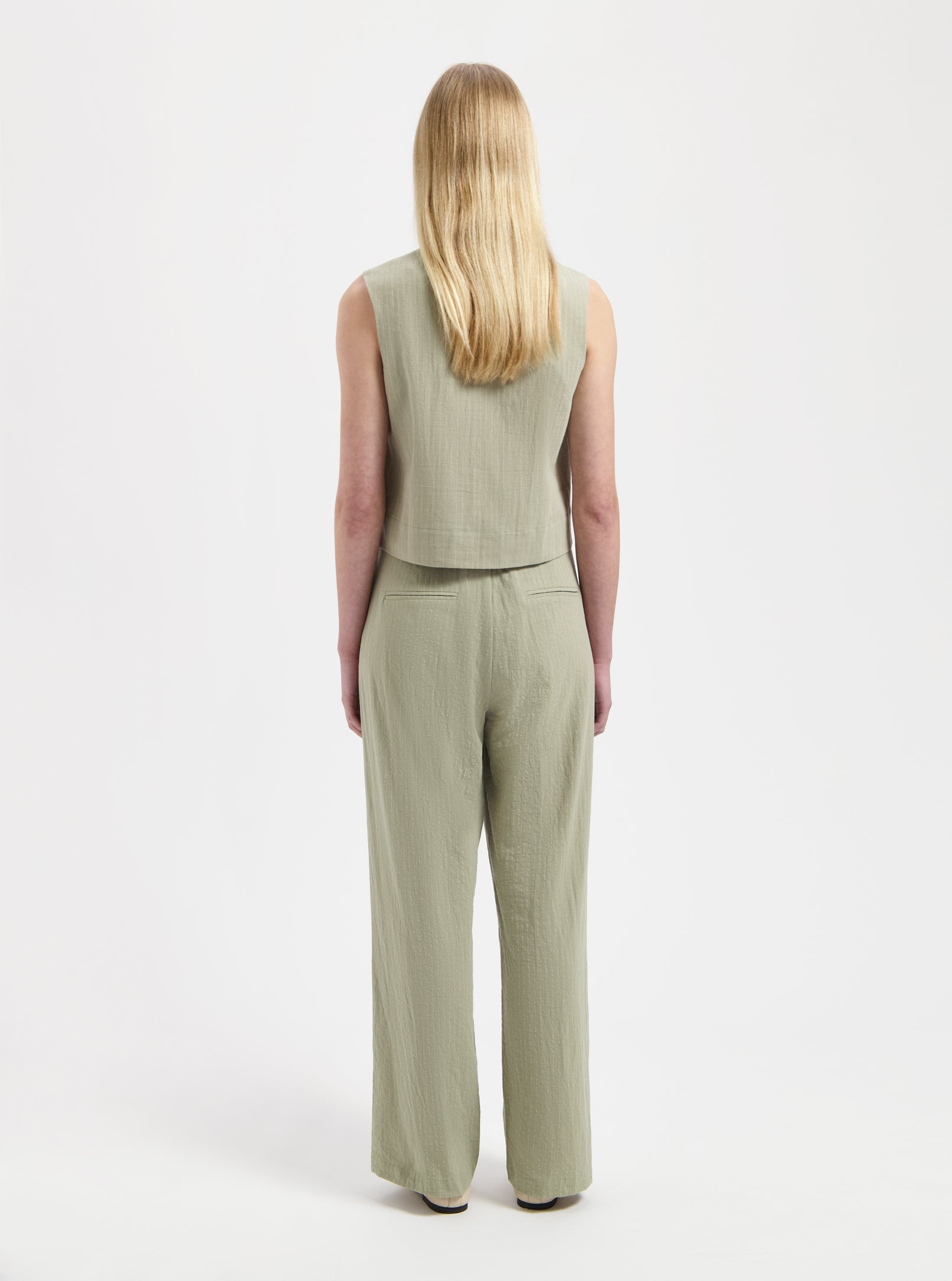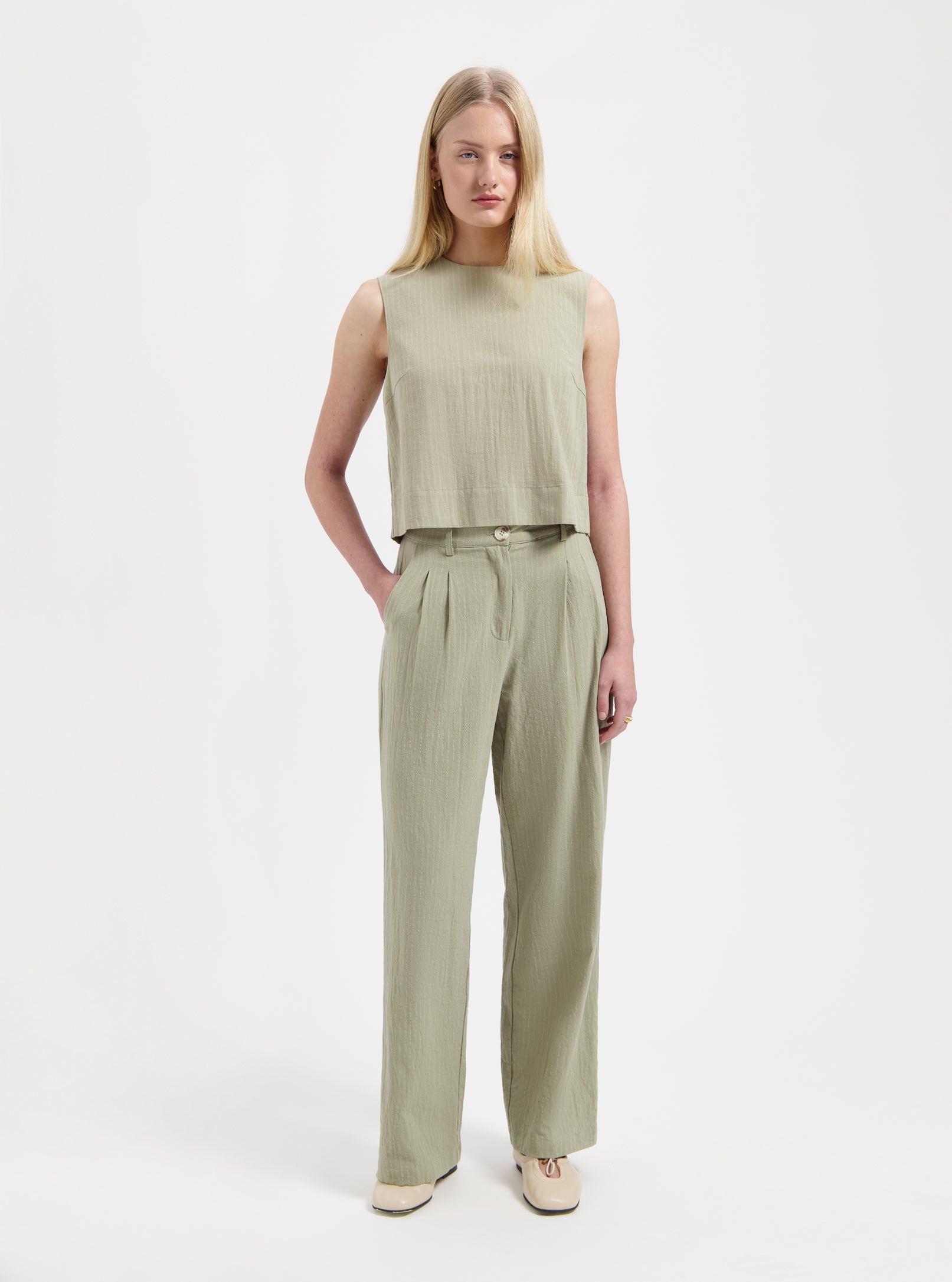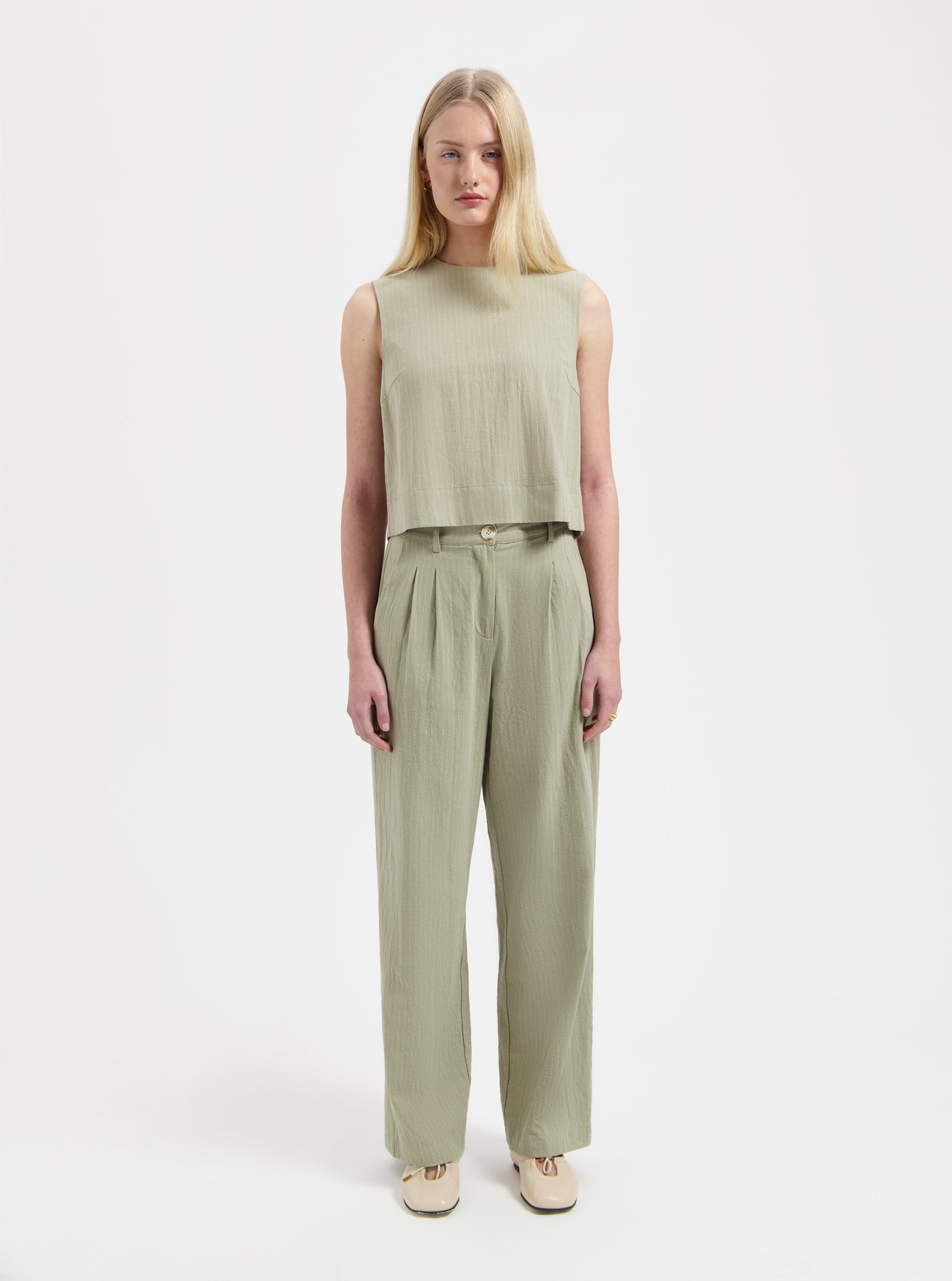 The Mira Top Light Green is a bold yet feminine piece that effortlessly combines structure with comfort. This sleeveless top features a tailored, structured silhouette that highlights the natural shape of the body while offering femininity and versatility.
