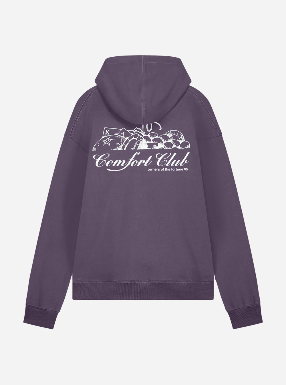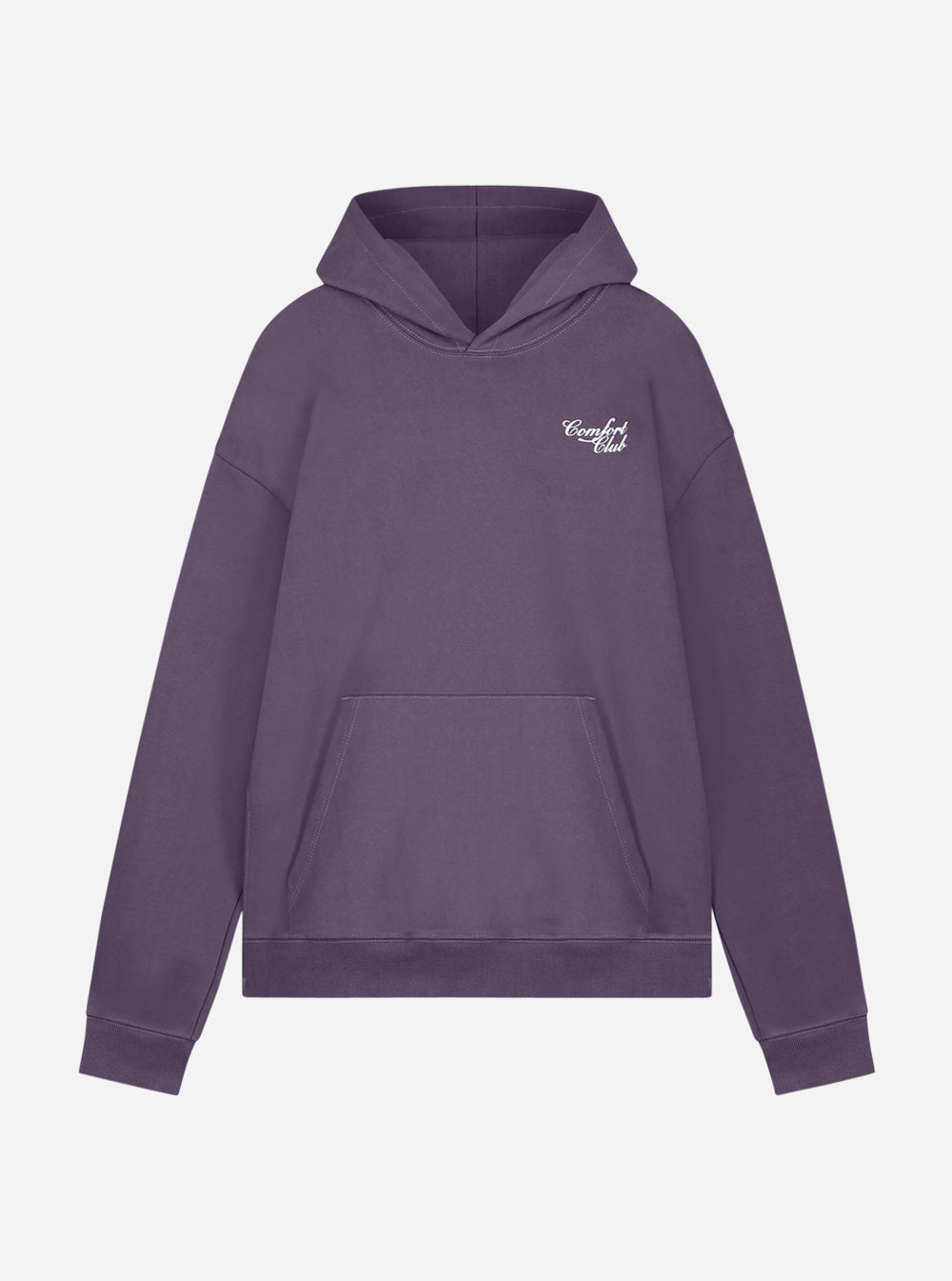 Midnight Purple hoodie with a slightly oversized fit in a heavy weight jersey cotton. Super soft, pre-shrunk and piece dyed for the ultimate jersey. Ribbed hem & cuffs. Comfort Club Chip graphic print to the chest & back.