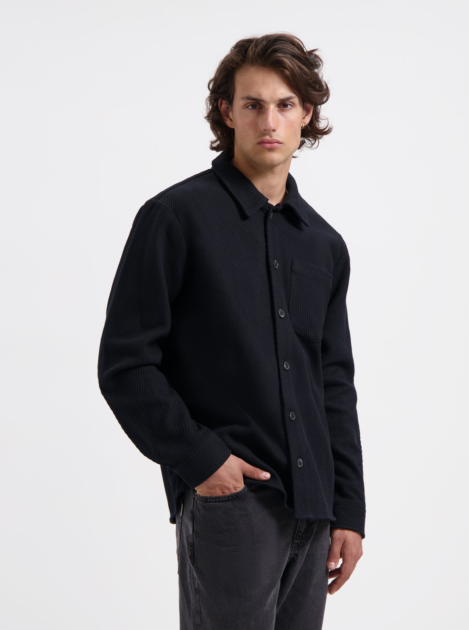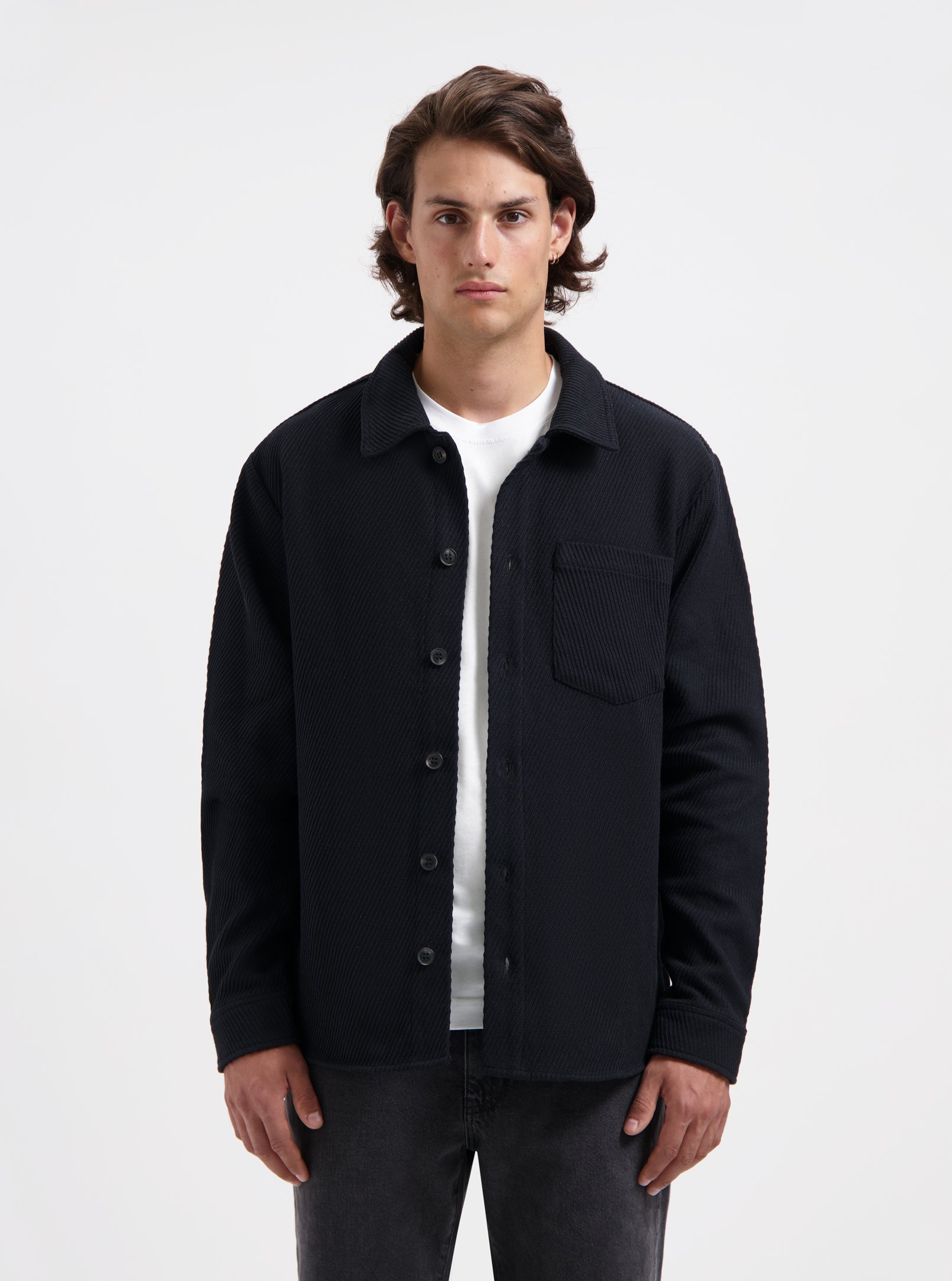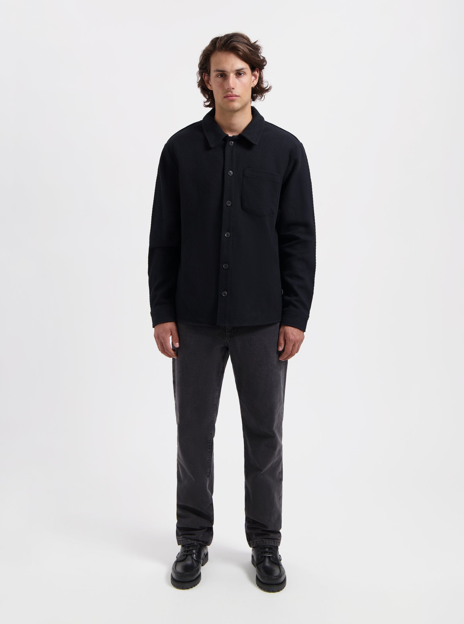 Black overshirt made from 100% cotton, offering a structured yet comfortable fit. Designed with classic shirt details and versatile enough to wear as a light jacket or mid-layer.