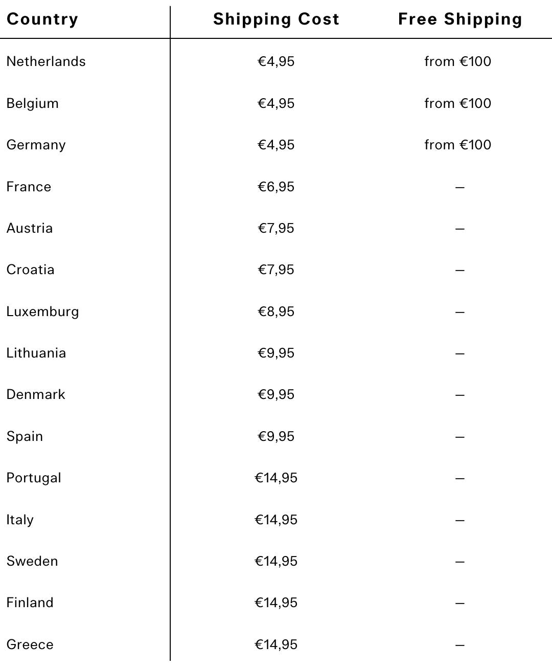 You can find below the shipping cost and free shipping conditions that apply to your delivery address.